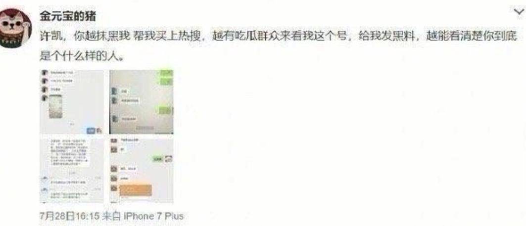 许凯还公开喊话大金,对方则晒出更多聊天记录,称许凯故意抹黑她,当时两人闹得也挺不愉快。
