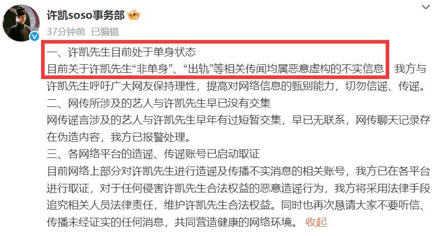 在此情况下,许凯的老板连发动态予以辟谣,声称女方完全在捏造事实,并声明许凯目前是单身状态。