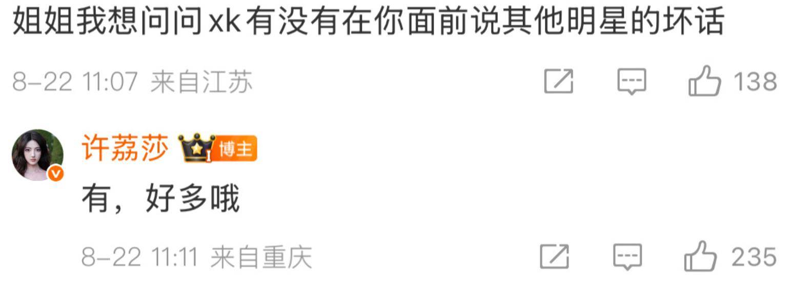 于正发声维护许凯之后,许荔莎并未就此退缩,还直接喊话于正予以质问,并且连续更新数条动态直接放锤。