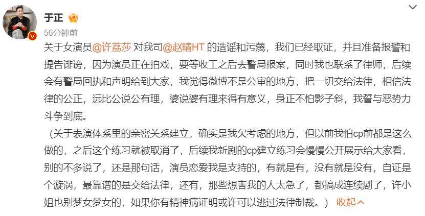 随着两位前女友的发声,于正又更新一则动态,直接点名许荔莎,宣称许荔莎涉嫌污蔑与造谣自家艺人赵晴,并表示自己相信法律的公正,还表示想要迫害自己的人过于心急,话里话外还嘲讽许荔莎精神不正常。