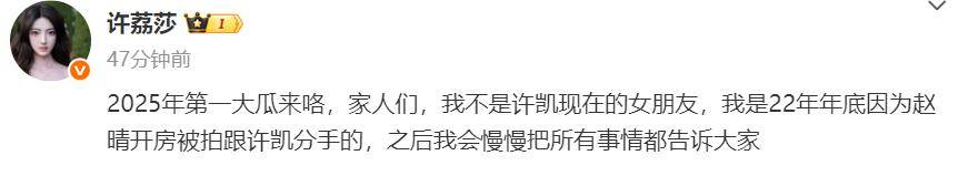 随后许荔莎爆出大瓜,表明自己与许凯早在2022年分手,原因是许凯与赵晴曾被拍到开房,而后两人分手了,在评论区,许荔莎还爆料许凯不仅出轨,还有其他不为人知的猛料。
