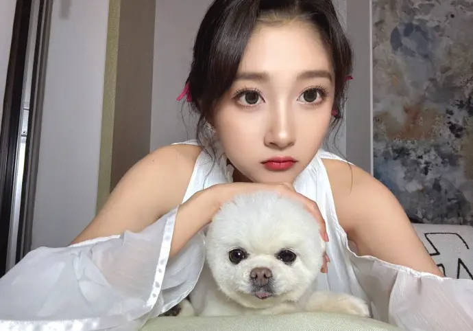 关晓彤妆容精致,与小狗互动氛围满是温馨亲昵。