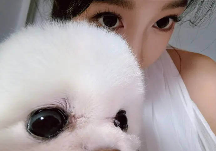 关晓彤的眼睛藏在小狗后面,满是温柔爱意。
