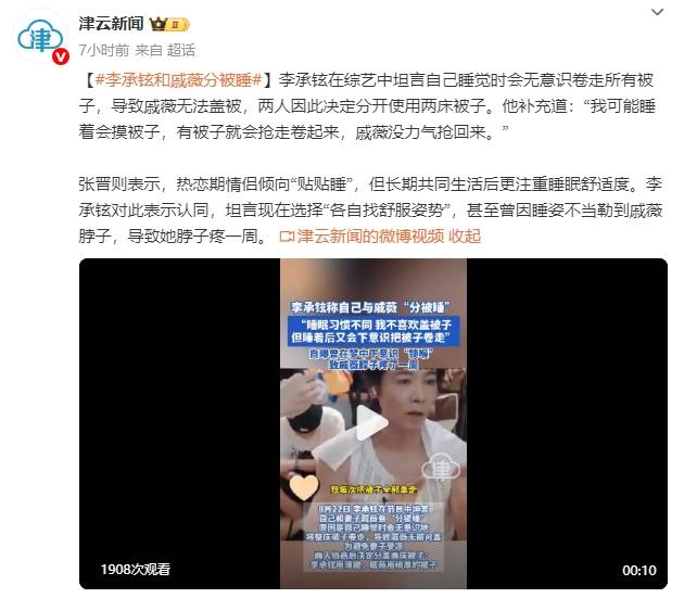 近日,李承铉在综艺中坦言自己睡觉时会无意识卷走所有被子,导致戚薇无法盖被,两人因此决定分开使用两床被子。他补充道:“我可能睡着会摸被子,有被子就会抢走卷起来,戚薇没力气抢回来。”