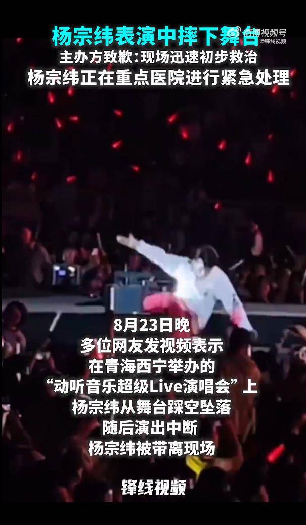 时间倒回8月23日晚,青海西宁“动听音乐超级LIVE演唱会”现场。杨宗纬正深情演唱《越过山丘》,却没想到自己先“越过了舞台”——唱至中途,因舞台机械装置突然后退,他一脚踩空,从约2米高的台子上侧身跌落!