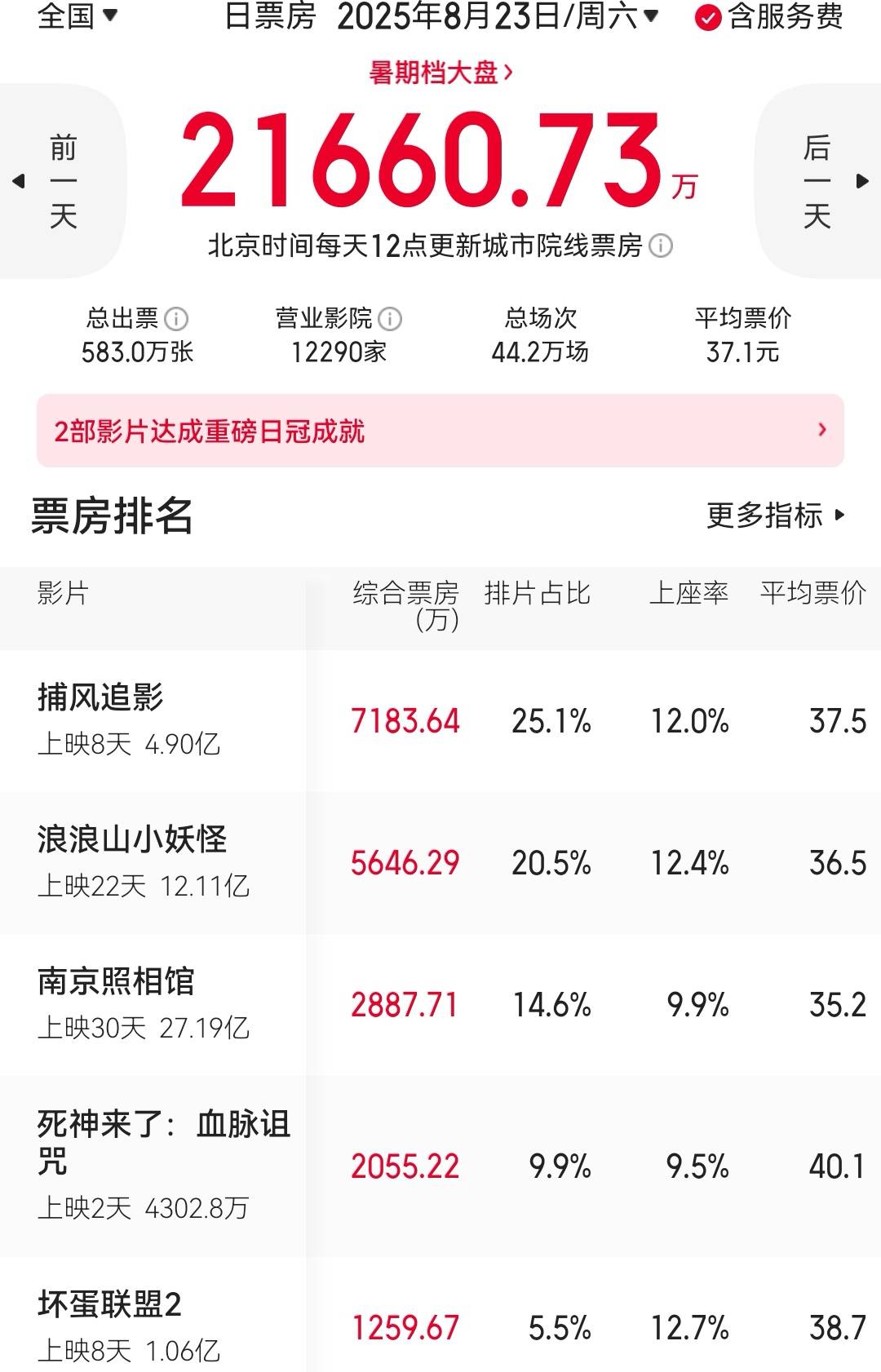 《捕风追影》目前是遥遥领先的单日票房第一,上映第八天单日票房7184万元,累计票房4.9亿元,预计最终票房将冲过11亿元。