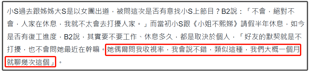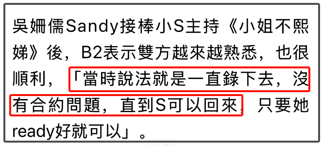 B2接受媒体采访也透露他和小S有联系,小S偶尔会问收视率,但似乎没有复工打算,而B2和吴姗儒约定的就是一直录到小S回归,没有合约限制,看来B2似乎也做好了小S长期不回归的准备。