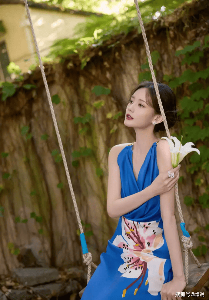 手里捏着一朵百合,坐在秋千上,抬头望向远方