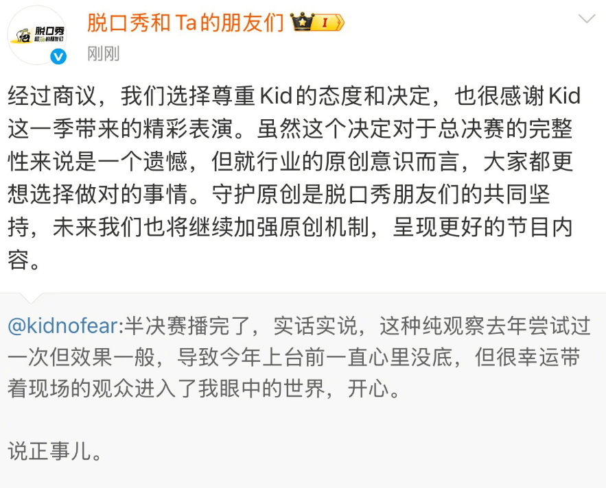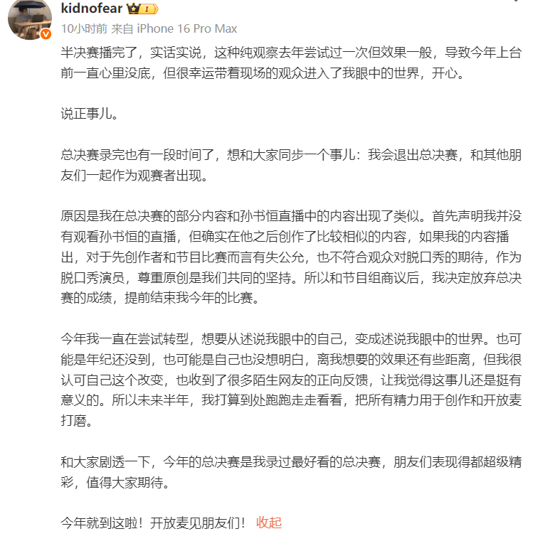 搜狐娱乐讯 8月25日,脱口秀演员kid官宣退出参与的综艺总决赛。他称退赛原因是自己在总决赛的部分内容和孙书恒直播中的内容出现了类似。“作为脱口秀演员,尊重原创是我们共同的坚持”,经与节目组商议后决定放弃比赛成绩。他也承诺在未来会将精力投入创作与开放麦打磨,期待与观众线下再见。