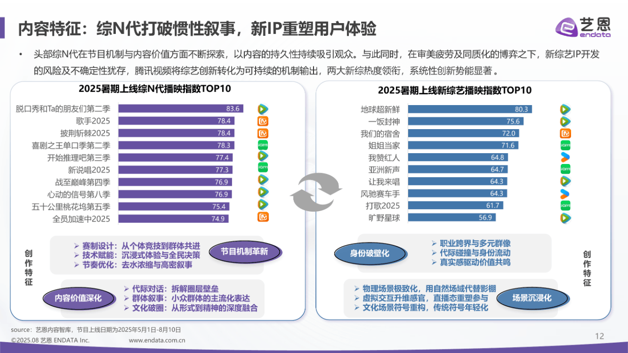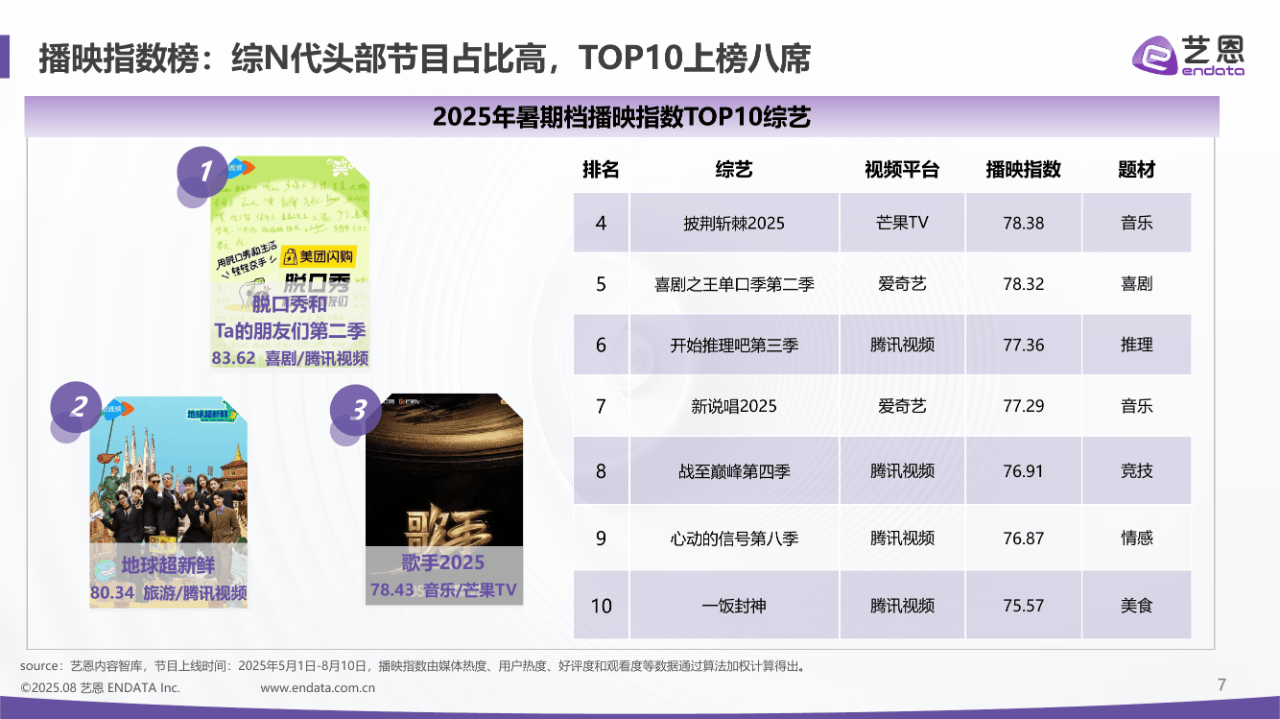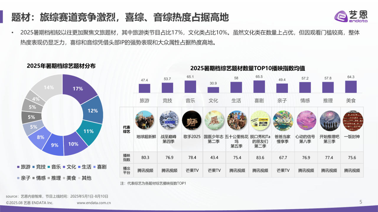 2025年暑期综艺市场呈现新老节目并行发展的态势,整体数量较前一年增长4.1%,达到77部。新IP在数量上占据优势,但整体热度略有下降,而综N代节目播映指数均值显著提升,反映出其品牌效应和内容创新的双重作用。旅游类综艺节目成为竞争焦点,占比达17%,文化类节目虽数量较多,但因观看门槛较高,热度表现相对较弱。喜剧与音乐类节目凭借头部IP的影响力和广泛的受众基础,成为暑期档的热门选择。从播映指数来看,旅游、竞技、音乐等题材表现突出,部分节目如《地球超新鲜》《歌手2025》等在平台和观众中获得较高关注度。