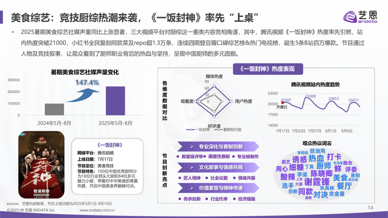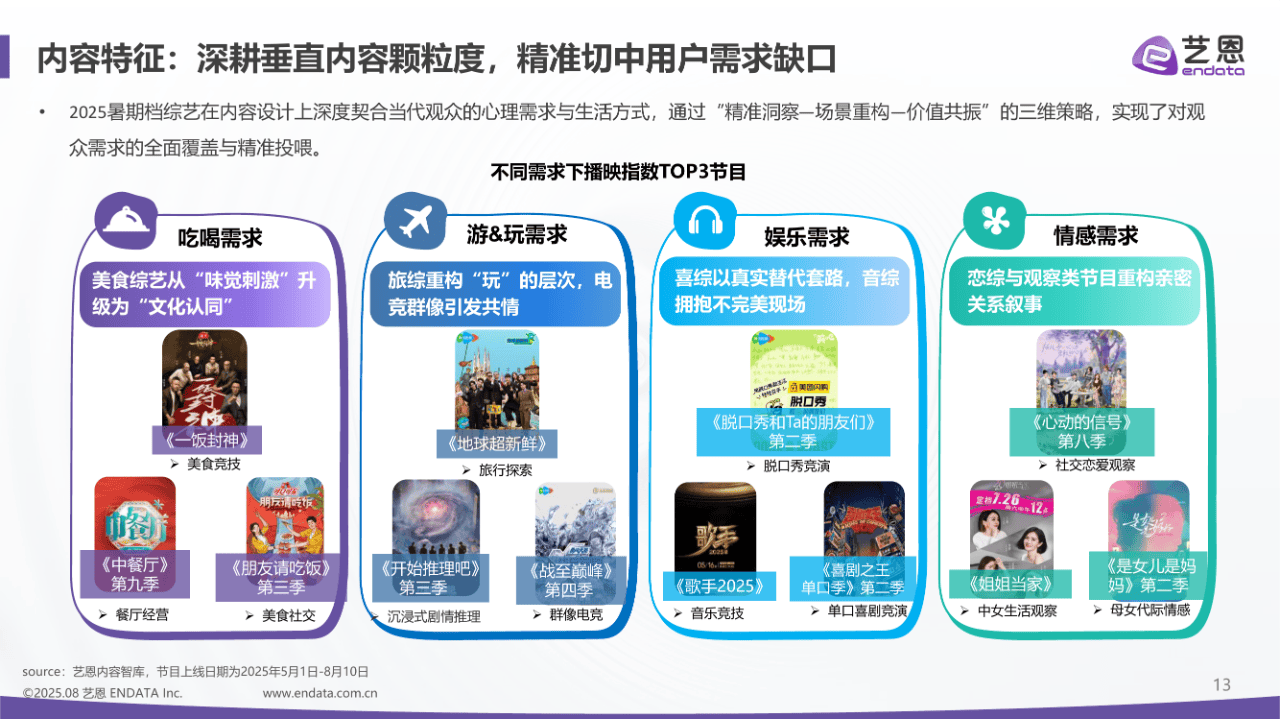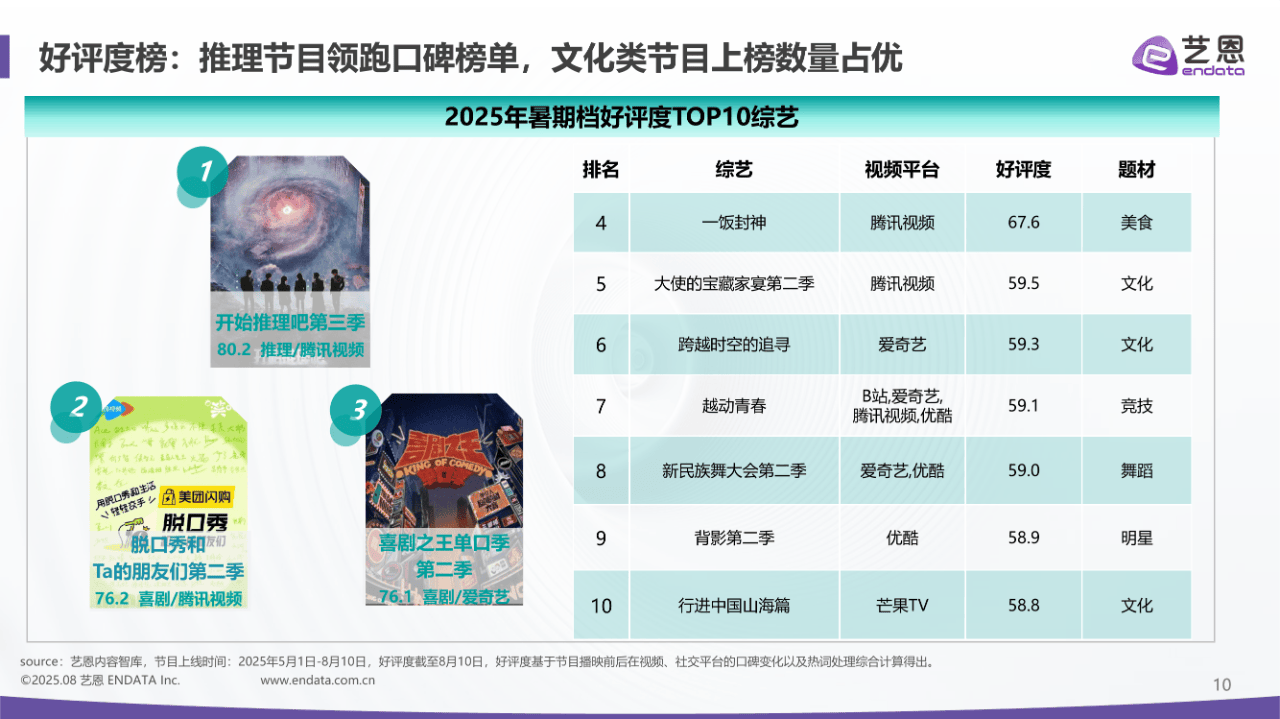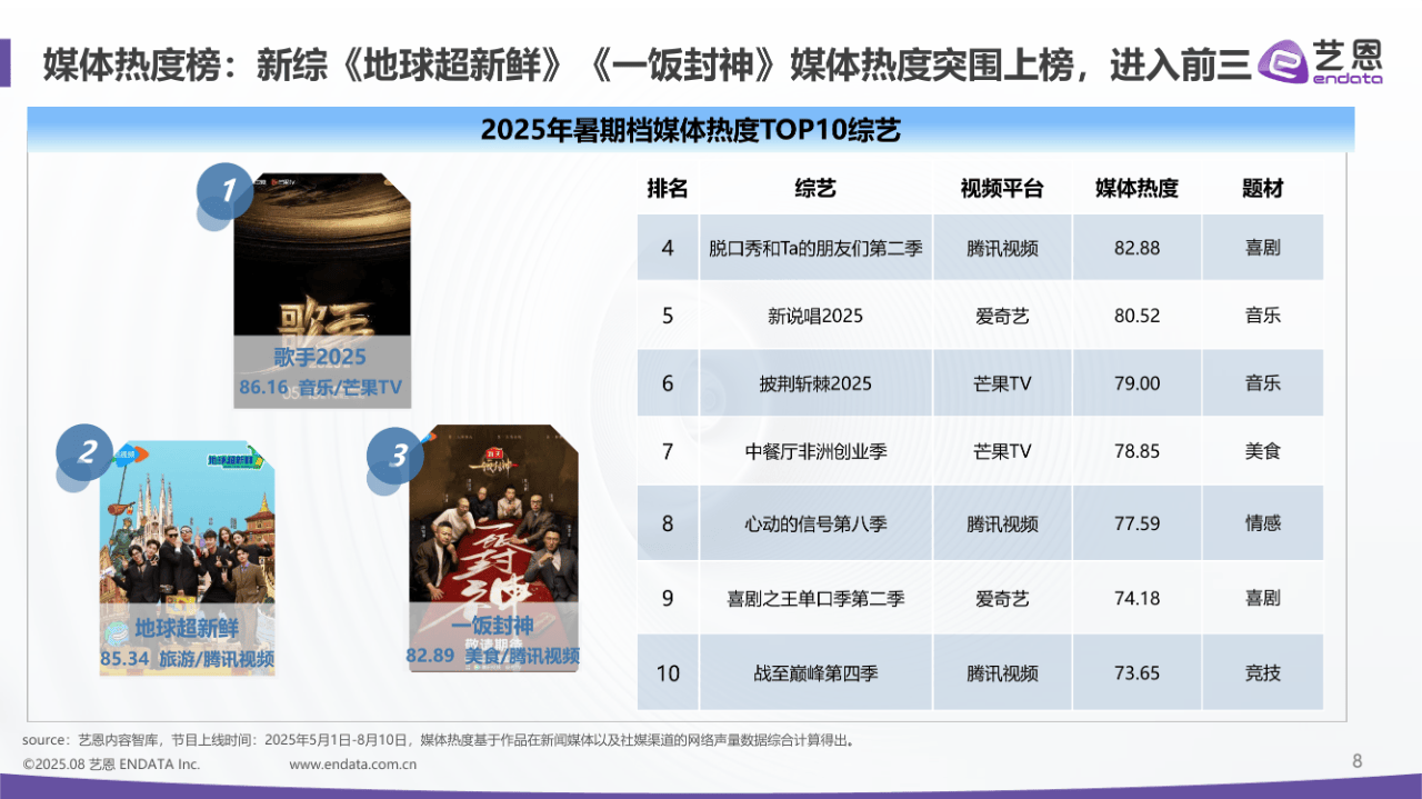 2025年暑期综艺市场呈现新老节目并行发展的态势,整体数量较前一年增长4.1%,达到77部。新IP在数量上占据优势,但整体热度略有下降,而综N代节目播映指数均值显著提升,反映出其品牌效应和内容创新的双重作用。旅游类综艺节目成为竞争焦点,占比达17%,文化类节目虽数量较多,但因观看门槛较高,热度表现相对较弱。喜剧与音乐类节目凭借头部IP的影响力和广泛的受众基础,成为暑期档的热门选择。从播映指数来看,旅游、竞技、音乐等题材表现突出,部分节目如《地球超新鲜》《歌手2025》等在平台和观众中获得较高关注度。