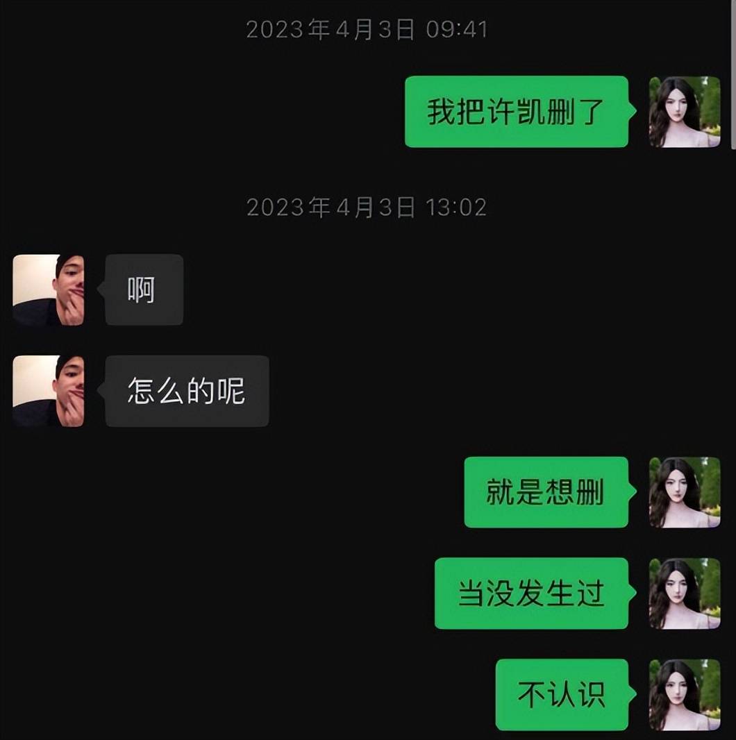 有了这样毁三观的发现,许荔莎自然就对许凯彻底死心,且将其联系方式删除。