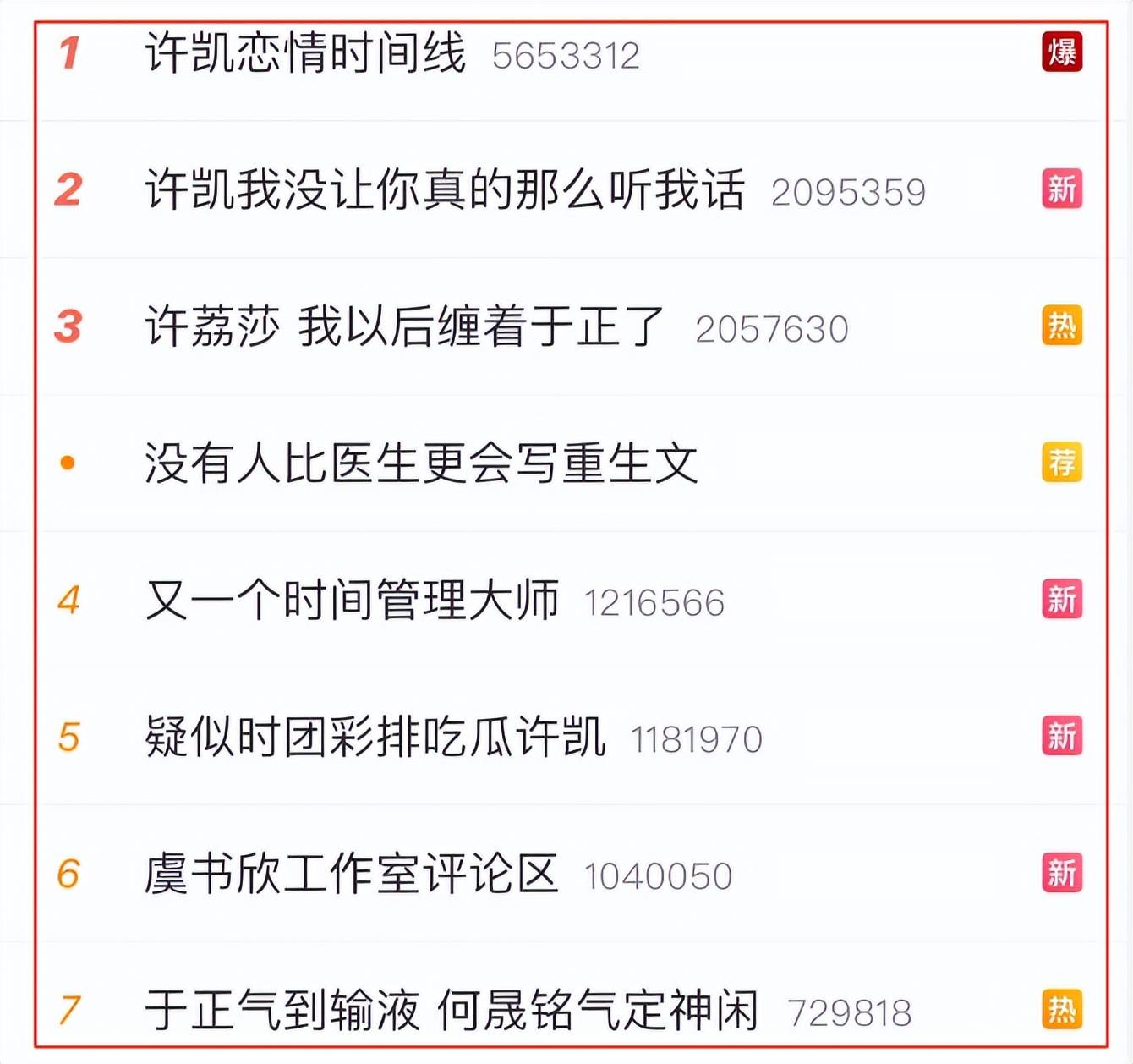 我的天 ,关于许凯的瓜,热搜前七直接上了六条。