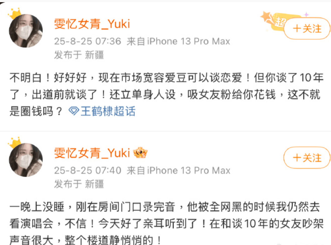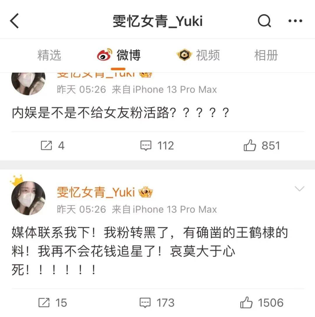 昨天凌晨开始,一个微博名为 @雯忆女青_Yuki(以下简称Yuki)的王鹤棣粉丝接连发博。