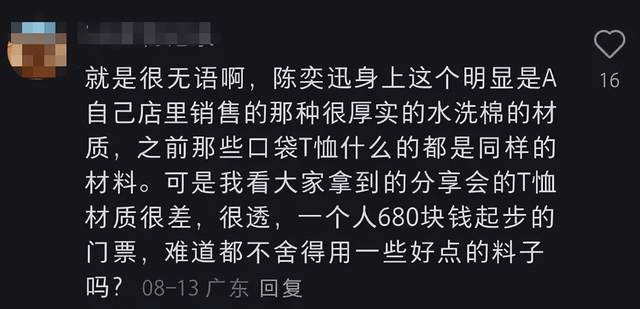 事实上,关于陈奕迅团队区别对待内地歌迷的事情已经数不胜数。通过这次事件,还有粉丝爆料,陈奕迅演唱会发布周边的问题一直很大。比如此前的纪念T恤,就被曝出质量有AB版,内部工作人员穿的,和粉丝拿到手的质量根本不同。