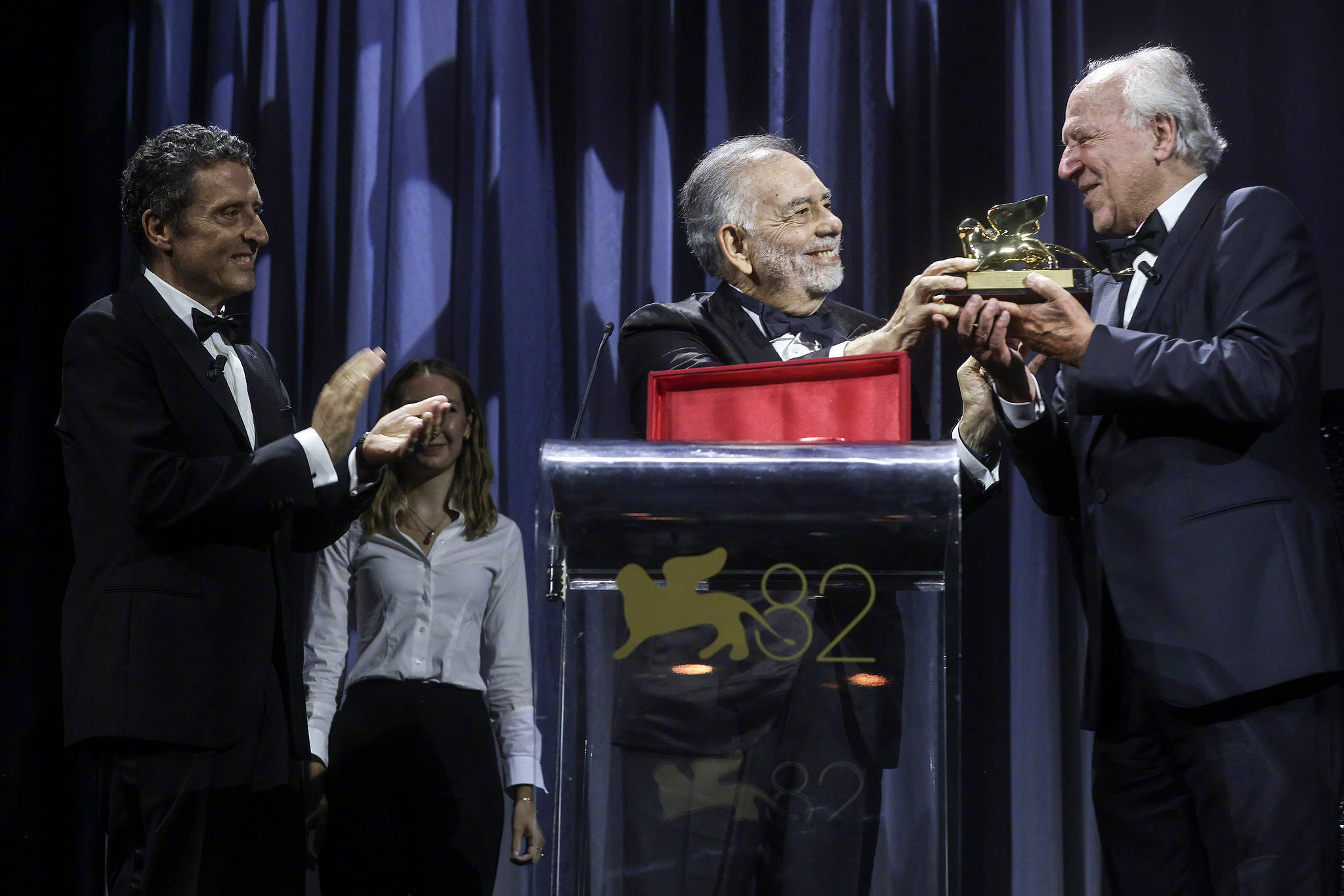 搜狐娱乐讯 意大利当地时间8月27日晚,第82届威尼斯电影节开幕,导演沃纳·赫尔佐格获威尼斯终身成就奖荣誉金狮。 弗朗西斯·福特·科波拉为他颁奖,表示:“我们必须庆祝世界上存在他这样的人这件事。他的电影非常独特、各不相同且都很卓越,沃纳就是一本百科全书。”