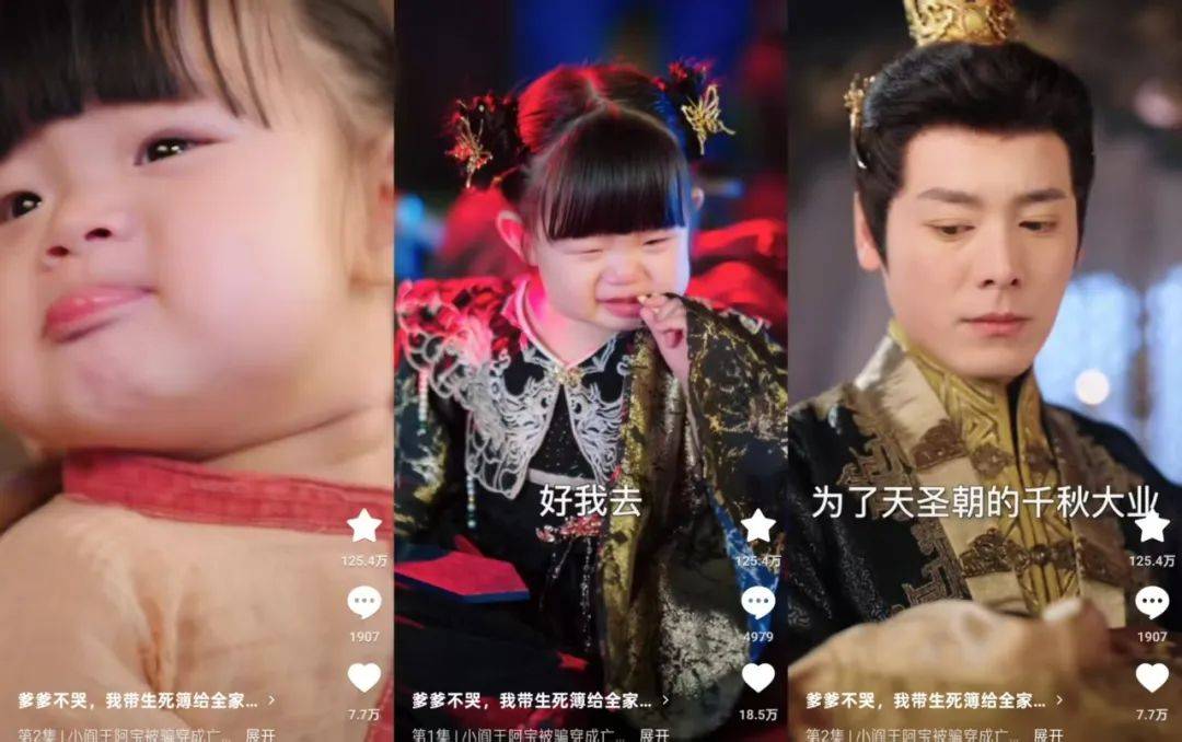 其中饰演阿宝的2岁小萌宝甜豆,也是《穿书之炮灰变身天道亲闺女》的主演,这部剧曾在5月达到10亿+播放量,也是萌娃赛道最受瞩目的短剧之一。