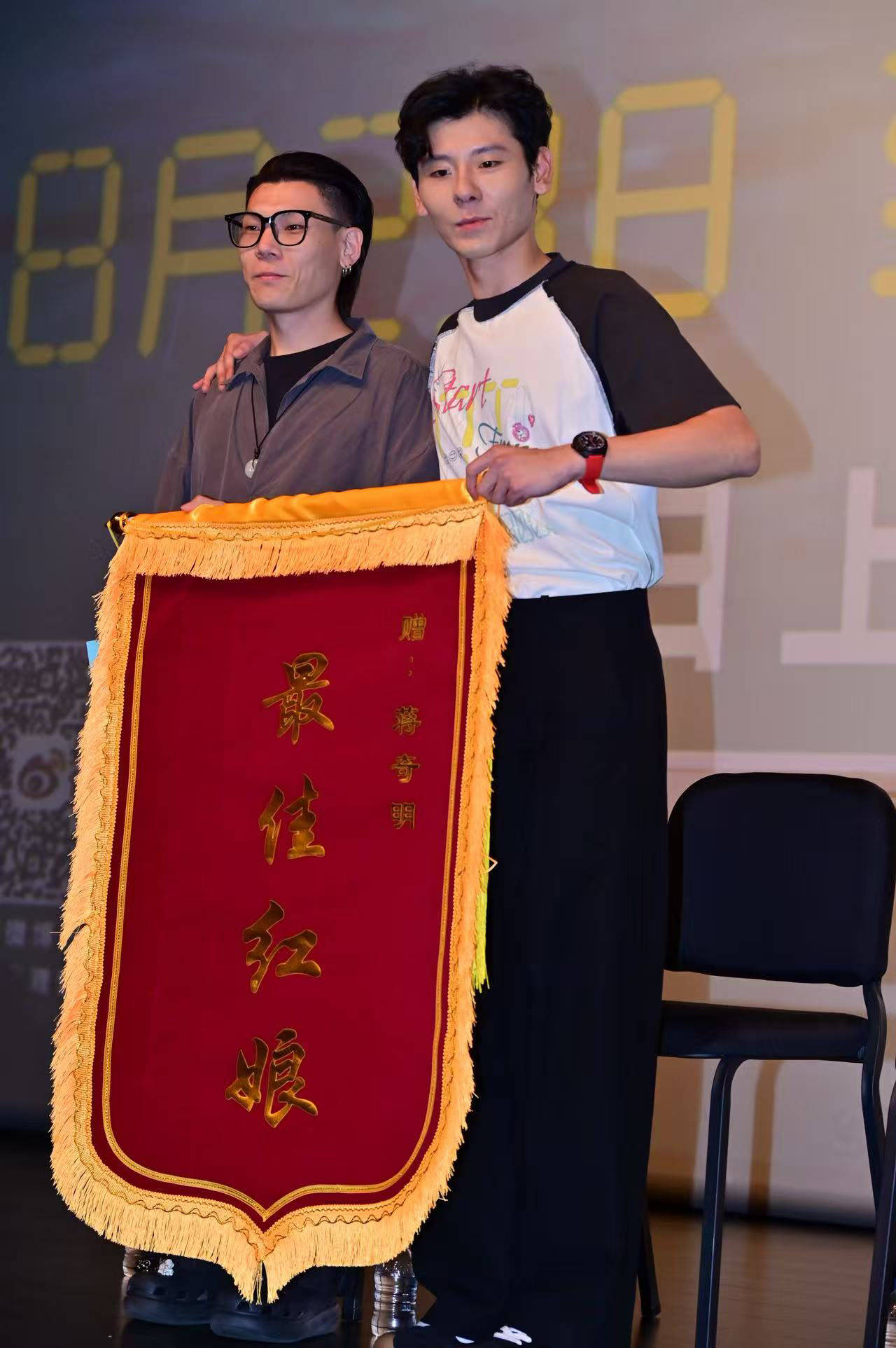 现场,有男观众表示女友是蒋奇明的超级粉丝,因为自己与蒋奇明长得有点像,两人才有了缘分,还当场给蒋奇明送上“最佳红娘”的锦旗,两人同框撞脸引全场爆笑。