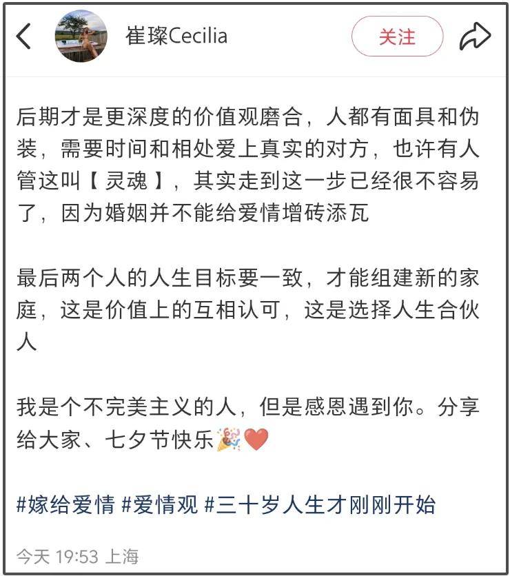 谈到陷入爱情的过程,汪雨再婚妻子表示首先要严格观察,了解对方人品,慎重开启关系,爱惜羽毛、自尊自爱,选择结婚是不想失去对方,相处愉快且有了价值观磨合,人生目标更要一致——官宣文案最后三个标签也是展露了女方心态,她觉得自己嫁给了爱情,30岁开启了新人生。