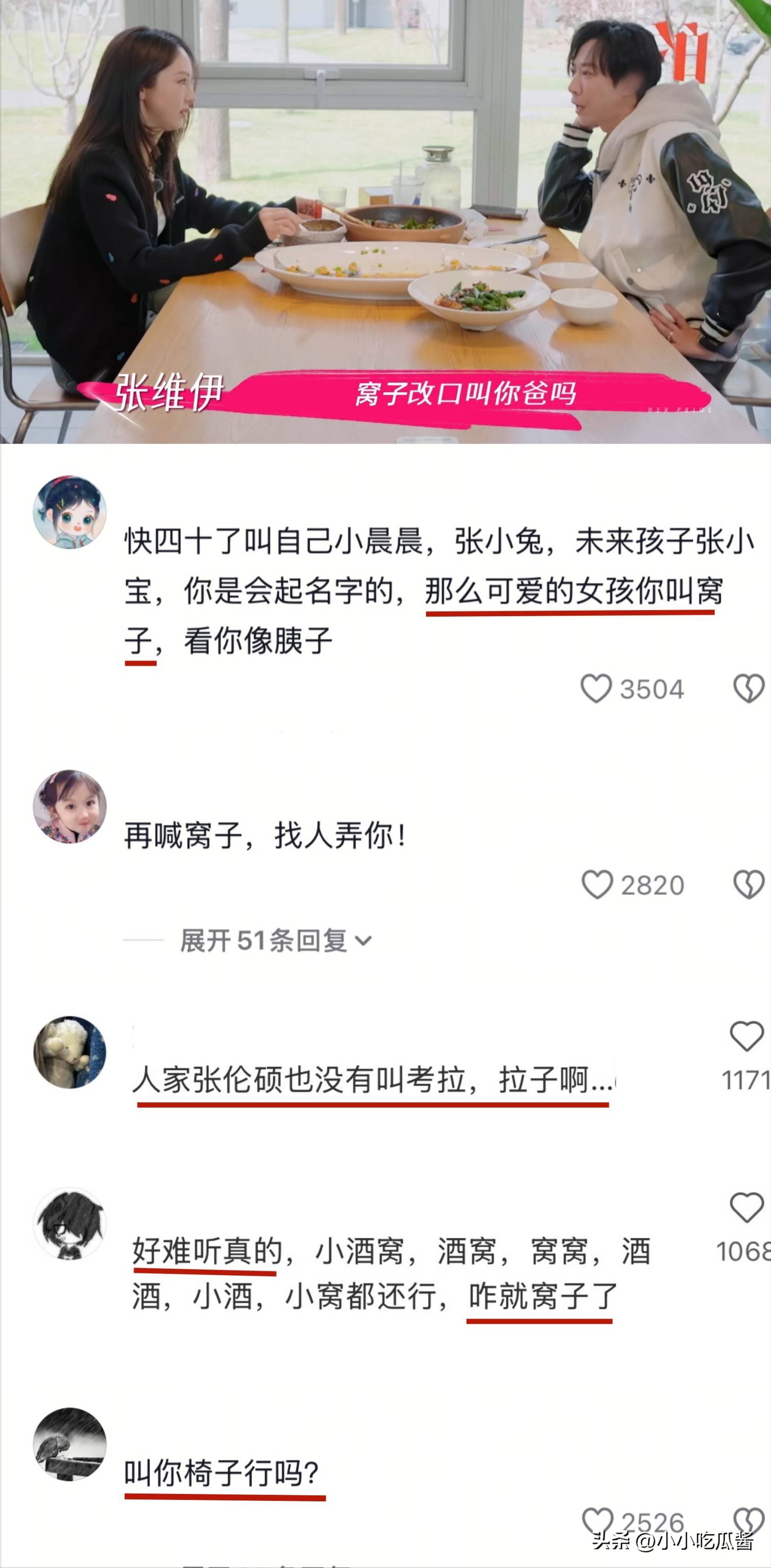 甚至连对董璇女儿的称呼也要另辟蹊径,他偏要把“小酒窝”叫成“窝子”,引来一轮又一轮的吐槽:“人家张伦硕都没把钟丽缇女儿叫成‘考拉’或‘拉子’呢!”这类操作在网民看来,缺乏真诚的主动之爱。