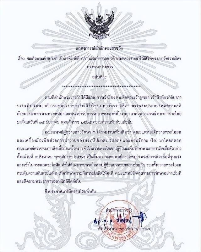 三年来,泰国王室总共只发布了四次健康公告。每一次公告都成为新闻焦点。第一次说是心脏骤停,低血压;第二次提到使用设备支持;后来两次则承认血液感染、透析、抗生素维持。每一次公告的用词都极其谨慎,透露的消息很有限,却足够让外界解读出病情的恶化趋势。