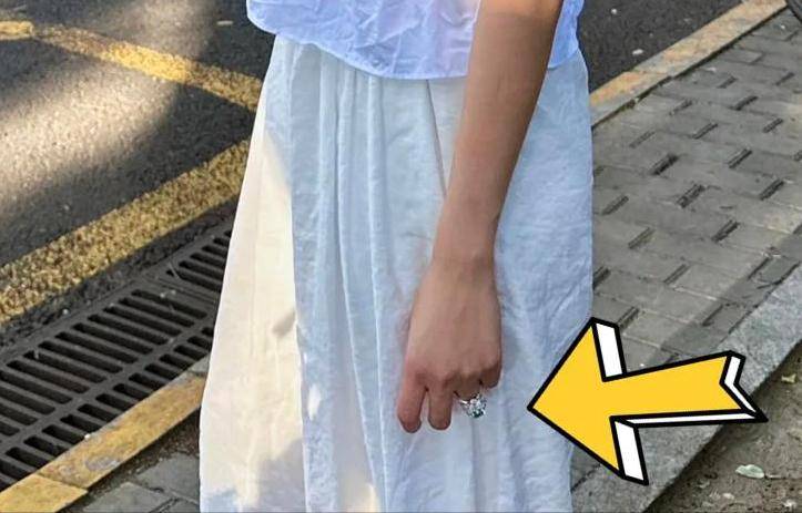 她的左手无名指上戴着一枚硕大的“鸽子蛋”钻戒,切割工艺精湛,目测钻石重量至少在5克拉以上。