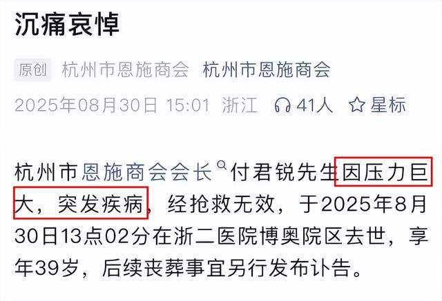 近日,据多人发文证实,杭州市恩施商会会长付君锐于日前不幸病逝,终年39岁。