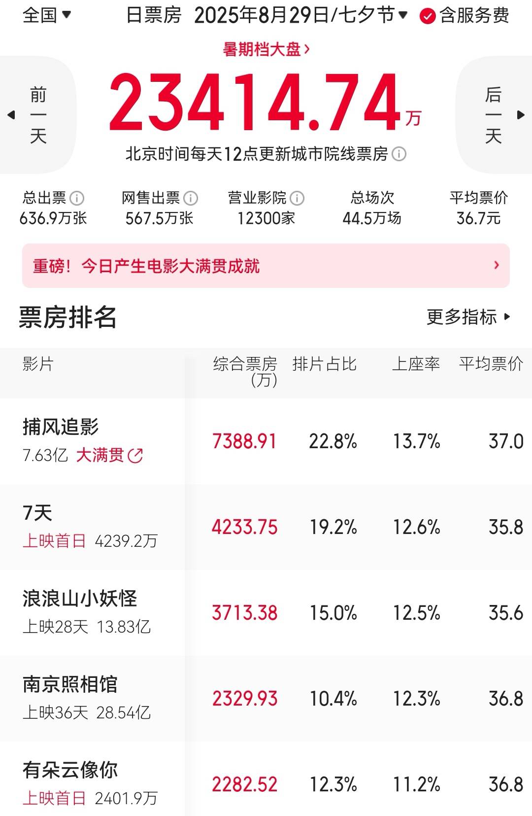 《7天》次日票房749万元,较首日暴跌82.3%,上座率从首日的12.6%跌到次日的2.9%,而《捕风追影》《浪浪山小妖怪》等老片当日上座率都在10%以上。