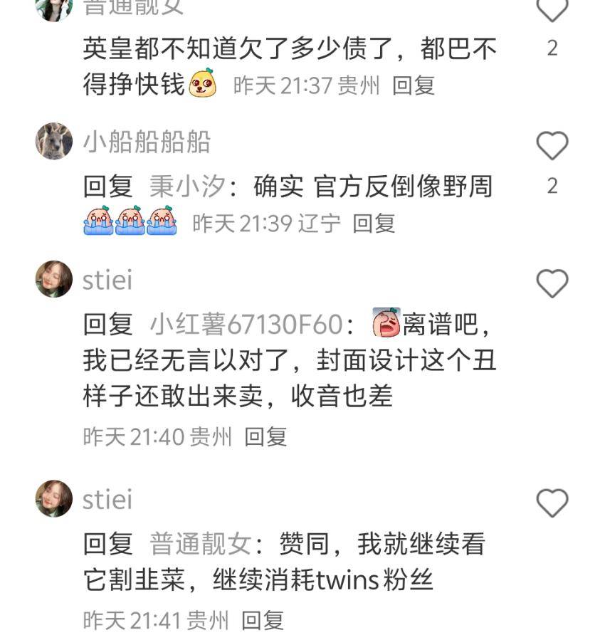 有网友提到,陈奕迅的专辑还不算最差,英皇女团twins的粉丝才叫寒心,这几年英皇割韭菜割得没有下线,新出的官方周边像是伪劣产品。
