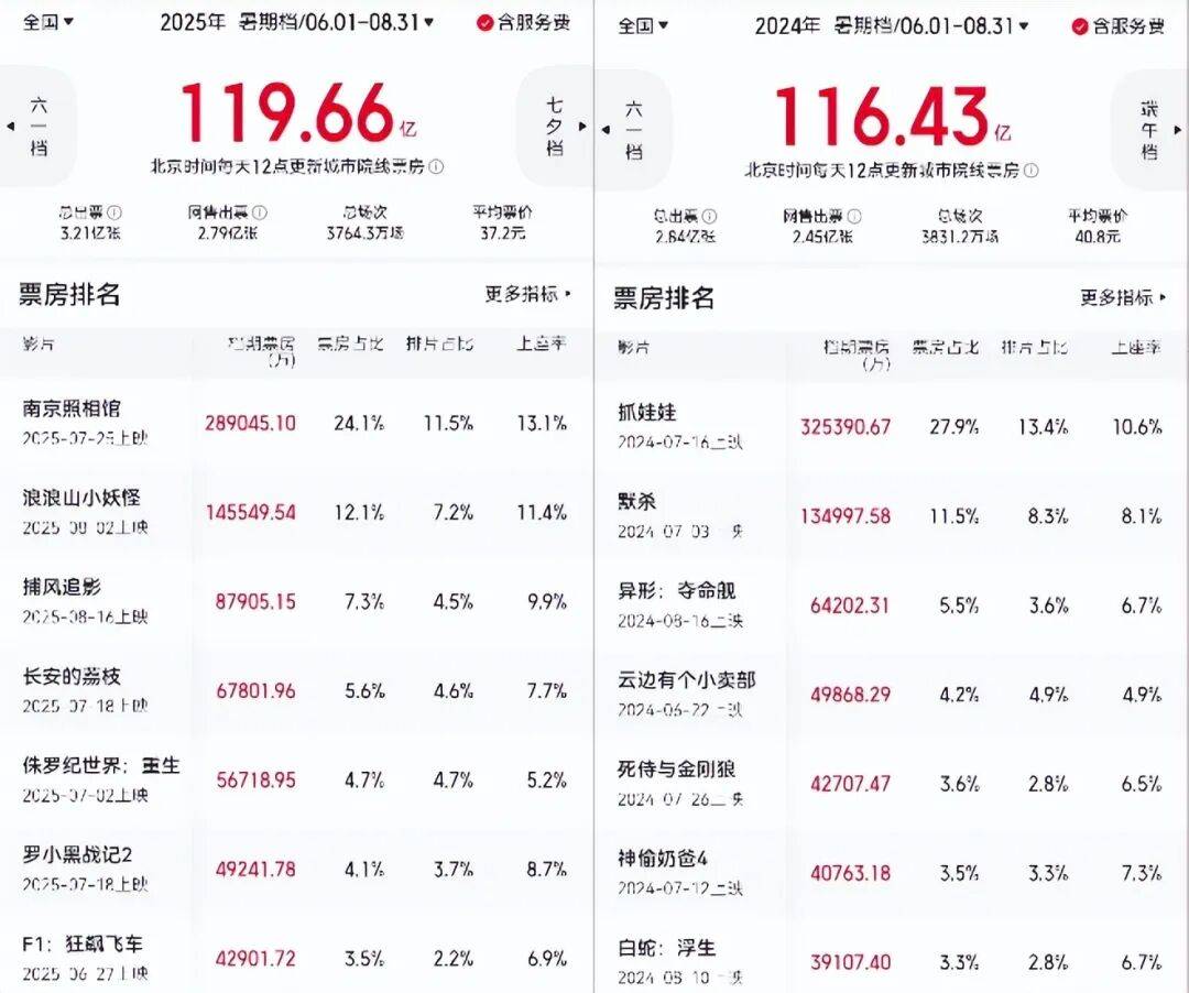 8月31日,2025年暑期档(6月1日至8月31日)落下帷幕,据猫眼专业版数据,截至当天24点,档期票房119.66亿元,比去年同期的116.43亿元小幅增长2.7%。令人欣喜的是,总观影人次3.21亿,比去年同期的2.84亿增长13%。平均票价37.2元,比去年同期的40.8元下降了9.67%。