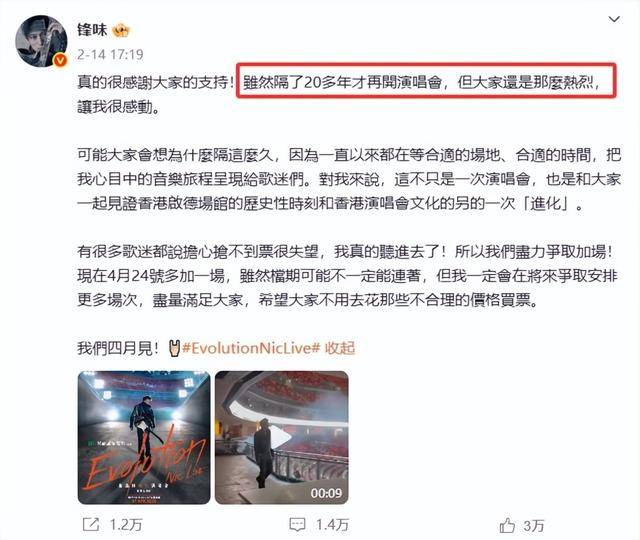 但眼看英皇有难,这个 20 年没怎么开演唱会的人,最近一场接一场开唱,热度一次比一次高 —— 这么一来,英皇的关注度上去了,资金问题自然也能缓解不少。