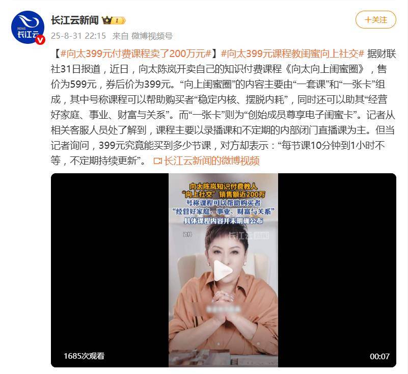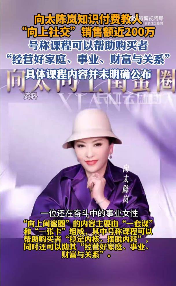 近日,“向太”陈岚突然在知识付费赛道抛出一记惊雷——其推出的个人课程《向太向上闺蜜圈》以599元定价、券后399元的姿态高调上线,短短时间三大平台销售额竟逼近200万元,引发全网哗然。