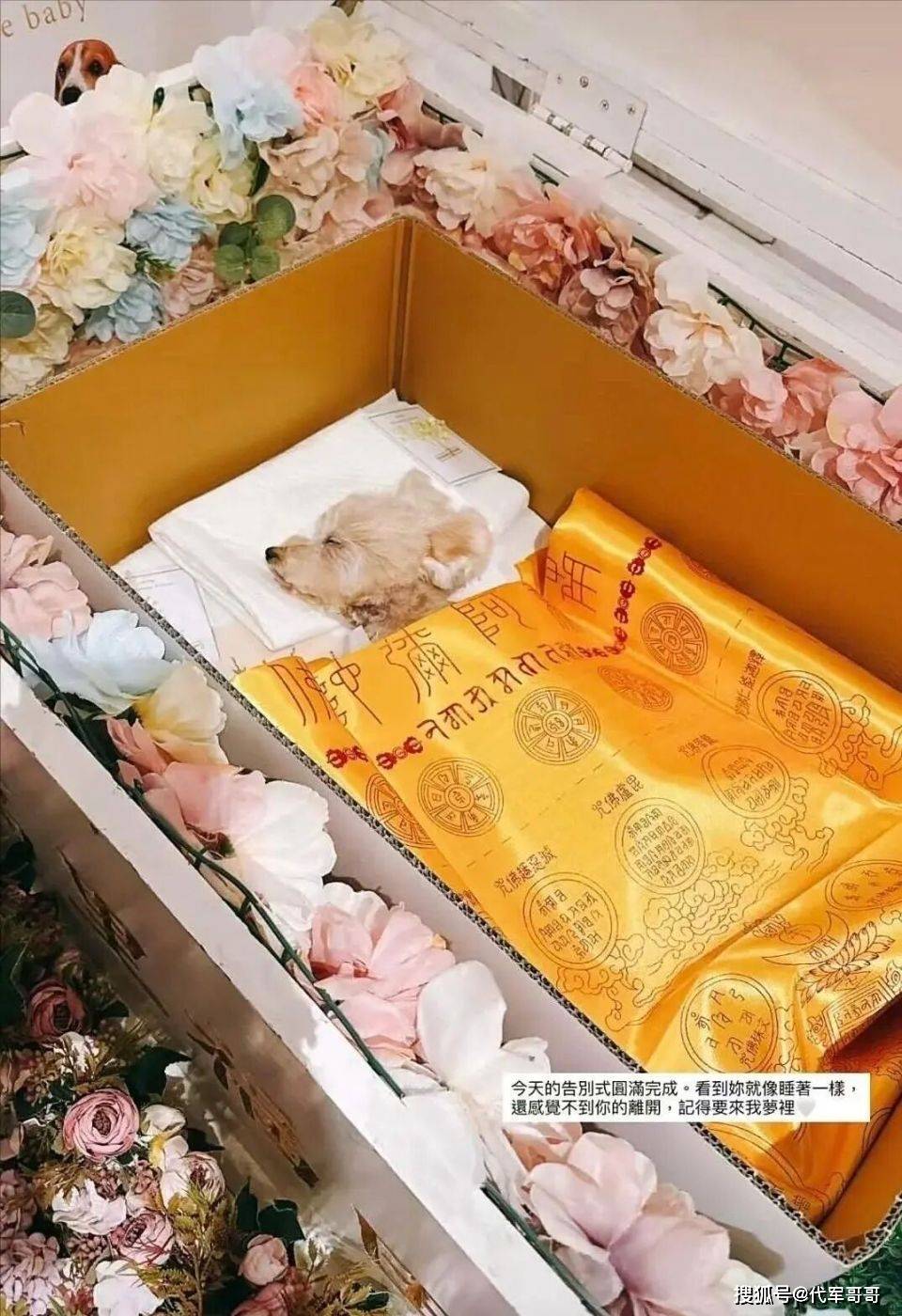 于是,马筱梅精心为狗狗布布筹备了一场盛大的告别仪式。葬礼现场,狗狗安静地躺在白色棺盒之中,身下垫着洁白的枕巾,周围簇拥着娇艳的花朵,身上还盖着金色的布,那模样就像只是睡着了一样。马筱梅还特意为狗狗诵经超度,足见她的用心。她在社交平台发文:“今天的告别式圆满完成,看到你就像睡着一样,还感觉不到你的离开,记得要来我梦里。” 字里行间,满是对狗狗的不舍与思念。