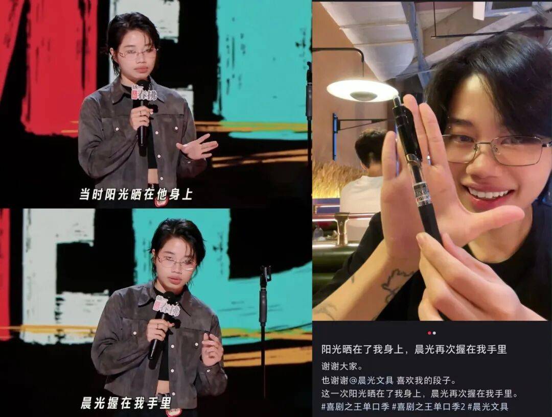 晨光文具就把这点用得恰到好处。演员李酌妍在节目里聊起童年用晨光圆珠笔给表哥纹身的经历,说出金句“阳光晒在了我身上,晨光握在我手里”。