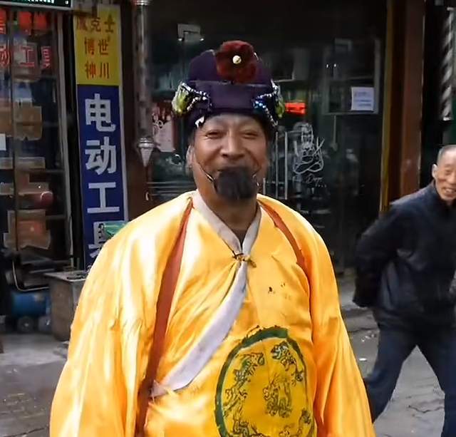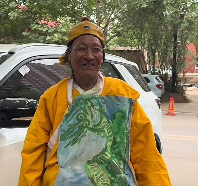 翻看过往网友拍摄的画面不难看出,梦群总会在过节的时候穿上黄色的“龙袍”,上面的龙并不是用针绣上的,而是自己所画,头上戴的帽子以及胡须等等,都是自己根据现有的材料,亦或者从某个垃圾堆中捡来的物品,进行改装的。