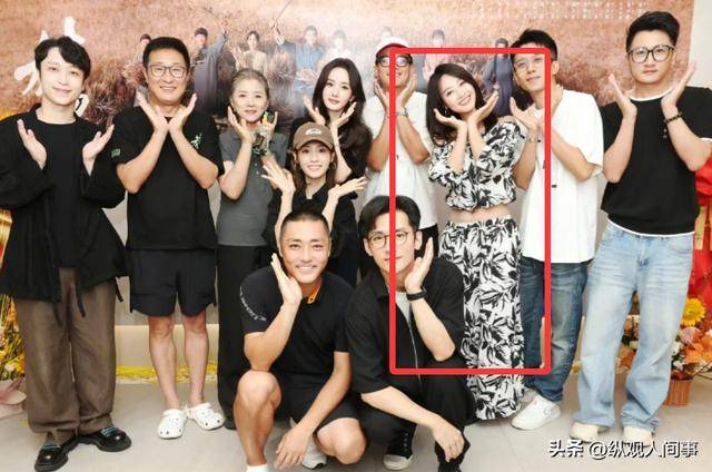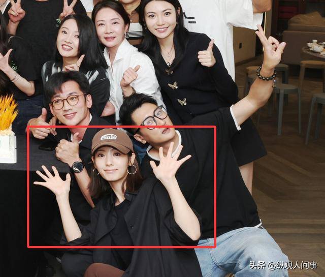 但是到了大合影的时候,蛋糕后面站得全都是主演的主创,杨幂顾及不了她,所以就只能蹲在最外侧。