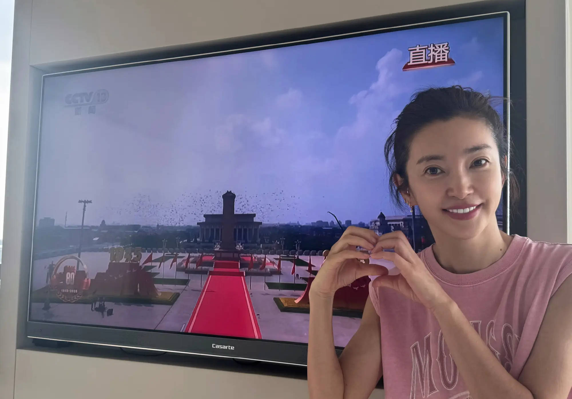 李冰冰居家看九三盛大阅兵直播。