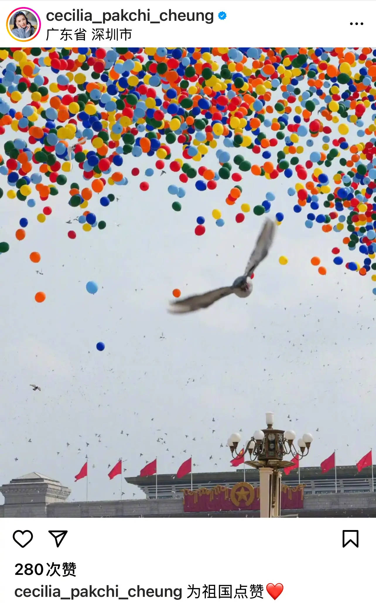当天,张柏芝还在国内社交账号上转发了央视新闻发布的关于九三盛大阅兵的动态,并配文称:“为祖国点赞,爱我中华!”