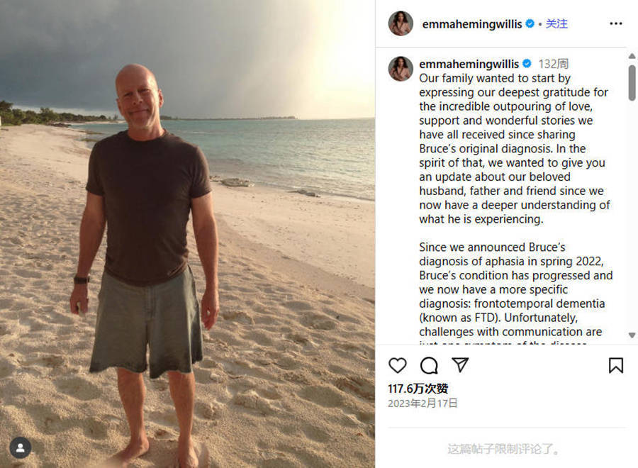 2022年,布鲁斯·威利斯的家人发布联合声明,宣布他将退出演艺事业。因为他被诊断患上失语症,这影响了他的认知能力和沟通能力。一年后,家人再次发文透露,他的病情进一步发展,且有了更具体的诊断结果:额颞叶痴呆(FTD)。