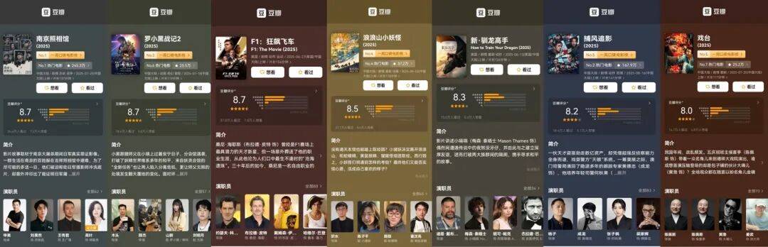 今年高分影片题材分布其实相当广泛,既有本土历史题材的《南京照相馆》、神话IP改编的《浪浪山小妖怪》、二次元IP改编的《罗小黑战记2》,也有好莱坞工业大片《F1:狂飙飞车》、《新·驯龙高手》,还有罕见的动作大片《捕风追影》。