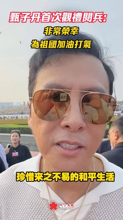 甄子丹坦言自己这是第一次来现场阅兵,真的很荣幸,看到祖国的强大,以及为和平而做出的努力,他也万分自豪。