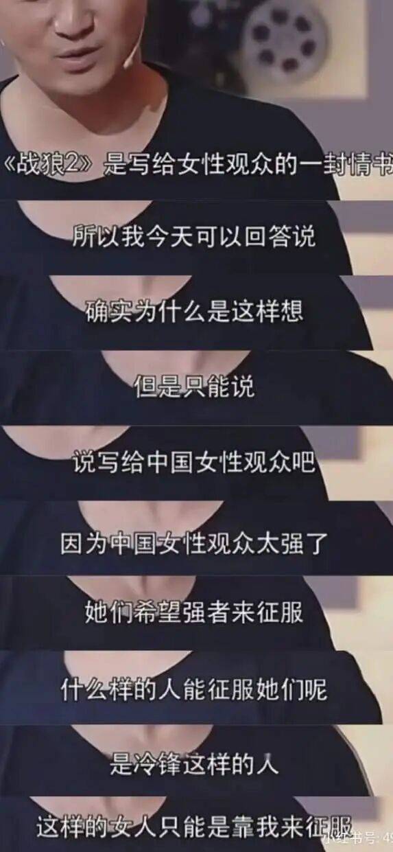 “《战狼》2是写给女性观众的情书,因为中国女性观众太强了,她们需要强者来征服……这样的女人只能是靠‘我’来征服”。