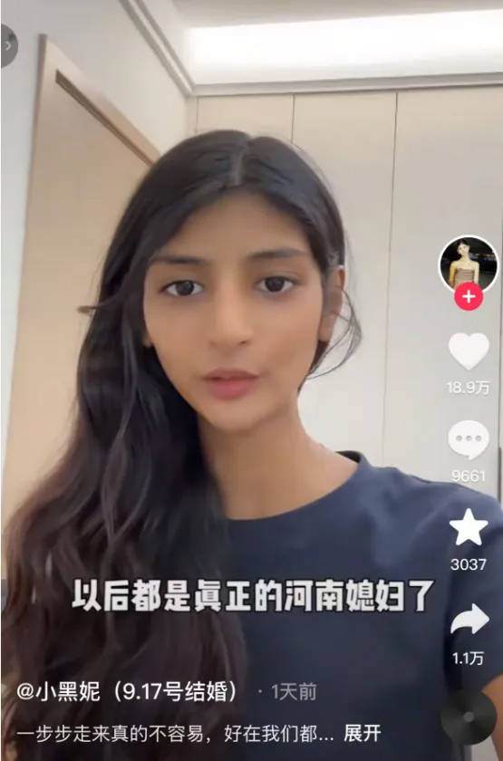 黝黑的皮肤和神似“埃及艳后”的长相,被网友称为“河南人自己的埃及艳后”。截至目前,小黑妮账号拥有180.8万粉丝,作品获赞2375.8万。小黑妮在视频中表示,以后都是真正的河南媳妇了。她和男友是在抖音认识的,男友一直默默支持她的自媒体事业,从扛设备到剪辑陪伴左右。男友会在生日的时候,买她最爱吃的榴莲蛋糕。一起养了很多宠物,还有一只比猫砂盆还要大的猫。