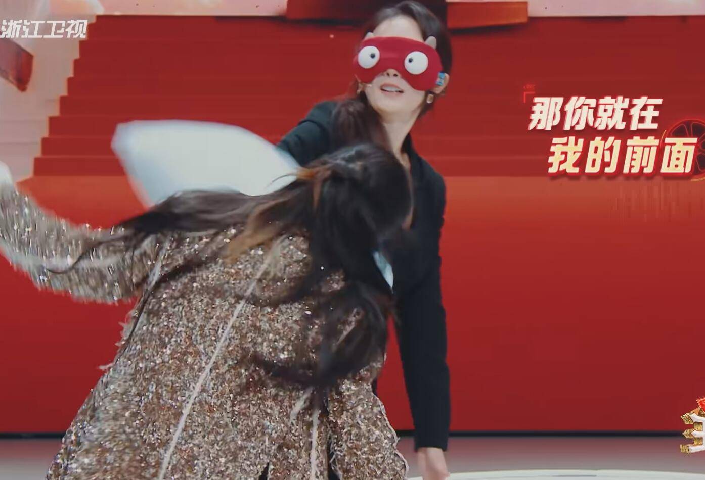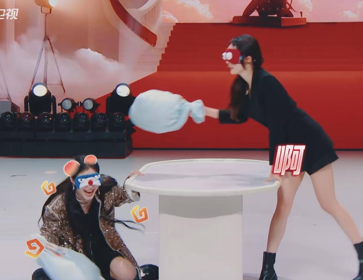 2. 双人对战环节,即便金靖与关晓彤调整站位,杨幂仍主导全场,与蓝盈盈形成压制性优势,颠覆了对其\"弱质女流\"的刻板印象。