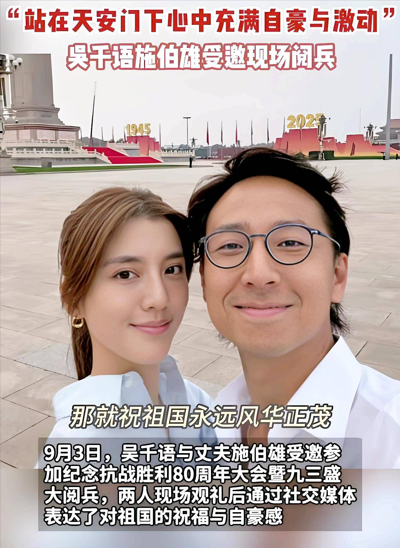 当天下午,吴千语在个人社交平台发文:站在天安门下,心中充满自豪与激动!非常荣幸见证这一刻,祝福祖国越来越好!