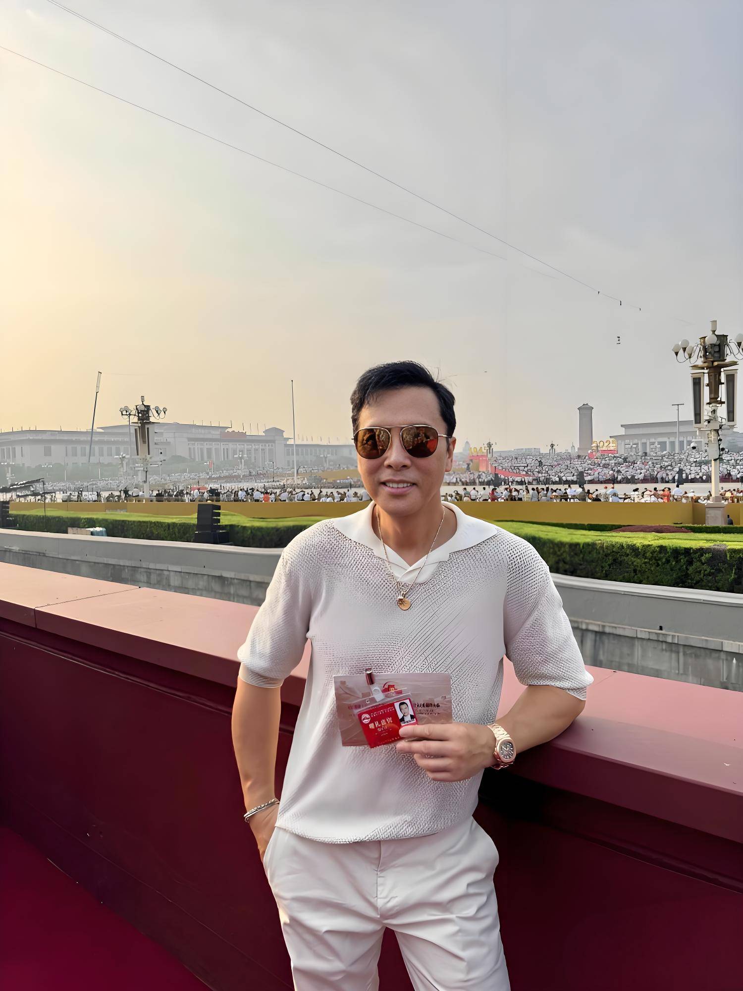 面对镜头,甄子丹右手举着自己的“观礼胸牌”和邀请函,脸上怡然自得。