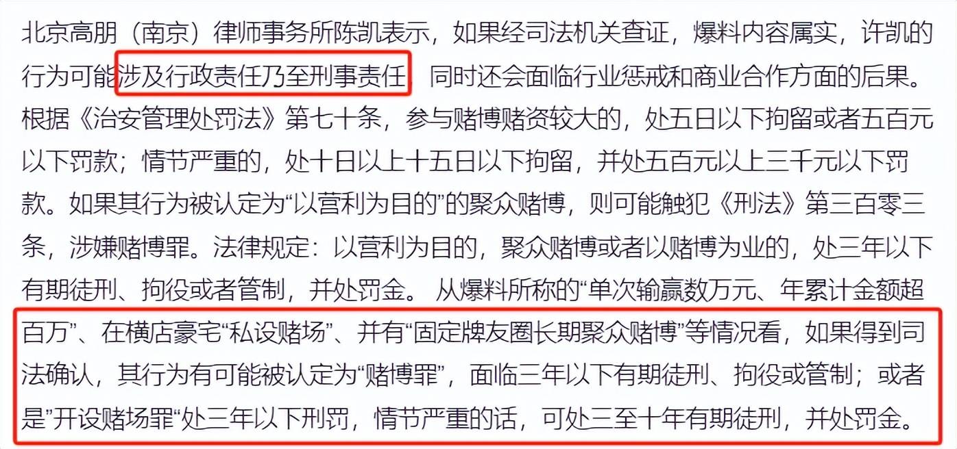 我们也去咨询了专业律师,许凯涉及的赌博罪,虽然判不了多重,但单纯赌博也要面临三年以下。反正横看竖看,许凯都违法了。