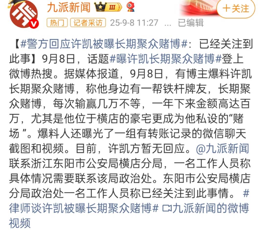 随后,有媒体致电浙江东阳市公安局横店分局,一名工作人员称具体情况需要联系该局政治处。而政治处一名工作人员也回应称已经关注到此事情。由此可见,许凯的赌博行为已经触及法律。