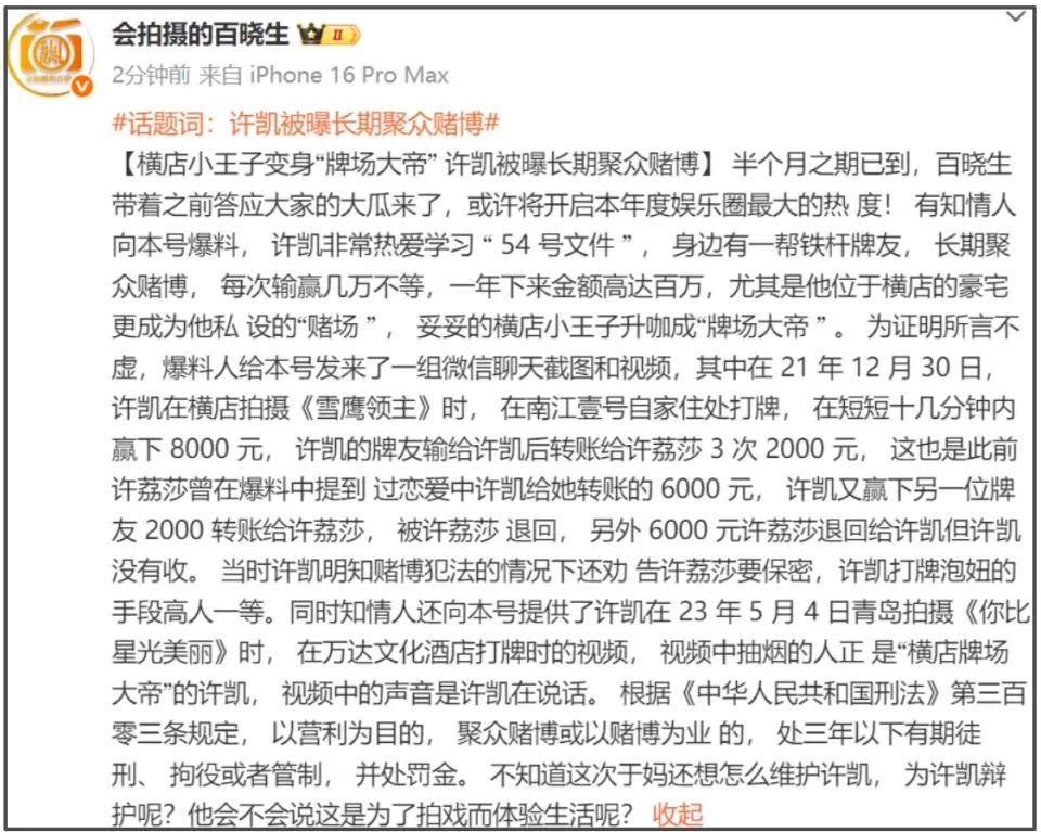 狗仔爆料男星许凯长期聚众赌博的事,引发了热议。根据狗仔的说法,许凯在剧组拍戏期间,经常会邀请好友打牌赌钱,每次输赢几万不等,一年下来赌资流水高达百万,他位于横店的豪宅更成为他私设的“赌场 ” 。爆料人还曝光了一组有转账记录的聊天截图和视频。