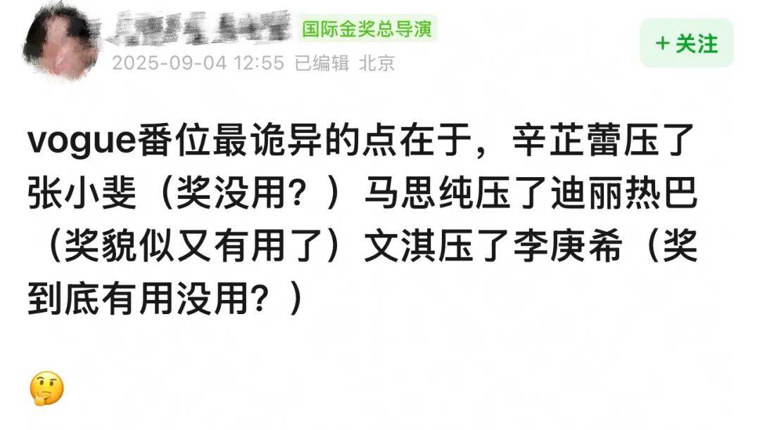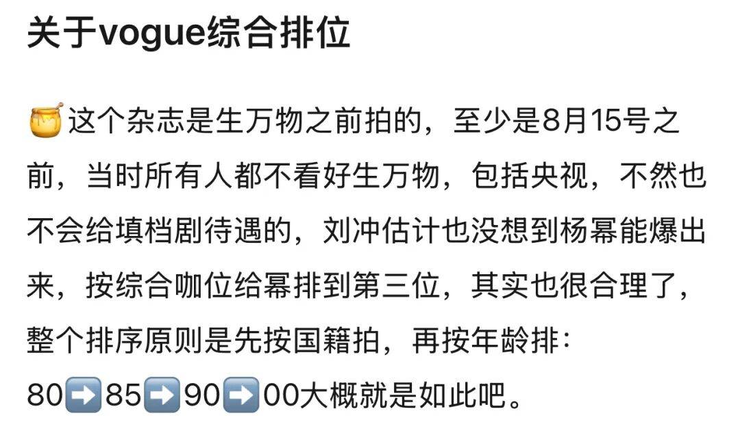 要南风说,倘若这真是Vogue有意为之的“咖位排序”,那么引发一些讨论和质疑,也确实在情理之中。